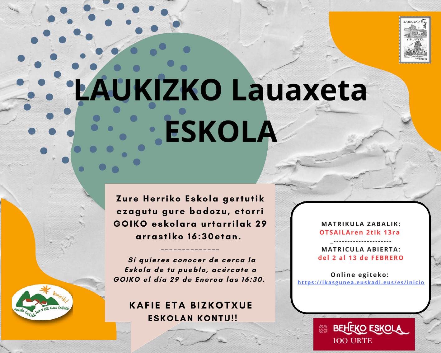 Laukizko Lauaxeta “ Eskola Txikia” da, landa eremuan kokatuta dago, Bizkaiko Uribe Butroe eskualdean. Gure herrian baserri giroa sumatzen da eta honek naturarekin harreman zuzena edukitzera bultzatzen gaitu.